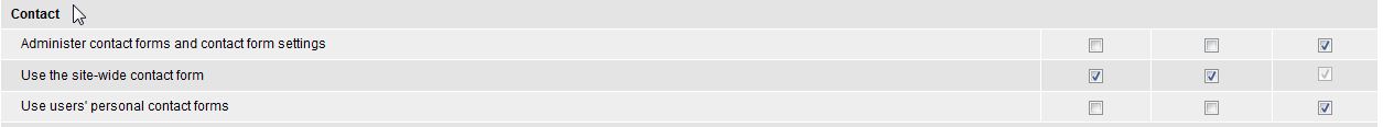 - Scroll down to the contact section and check the boxes you want to apply to the permissions. If you want everyone to be able to use your form, set Use the site-wide contact form to both ANONYMOUS USER and AUTHENTICATED USER.